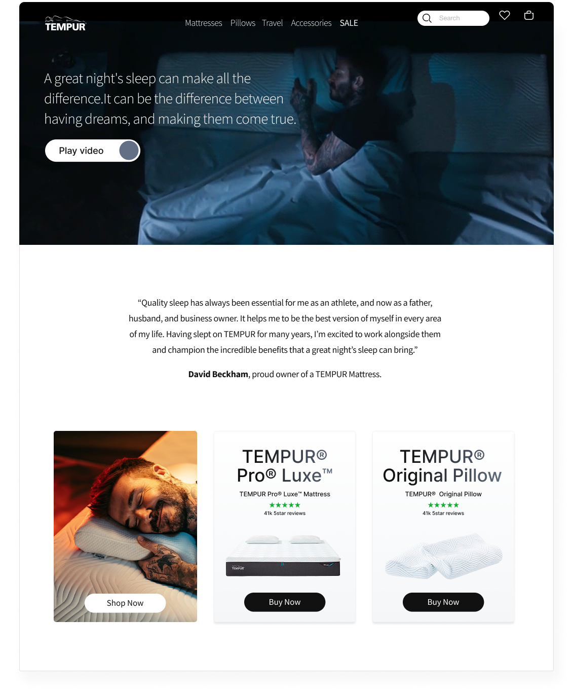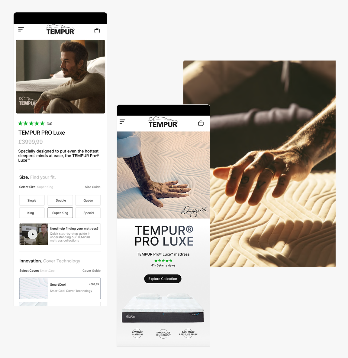My role began at the early concept stage, collaborating with the brand team on storyboards and creative drafts, ensuring that all digital deliverables aligned with both Tempur’s identity and David Beckham’s personal brand. I led a team of designers in producing landing pages, campaign assets, and eCommerce content, all of which required strict adherence to legal, brand, and talent approvals.