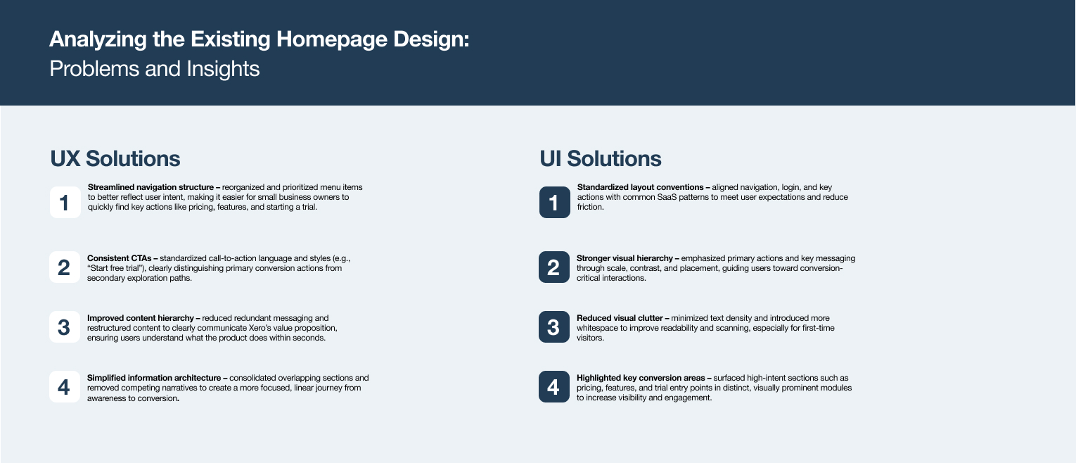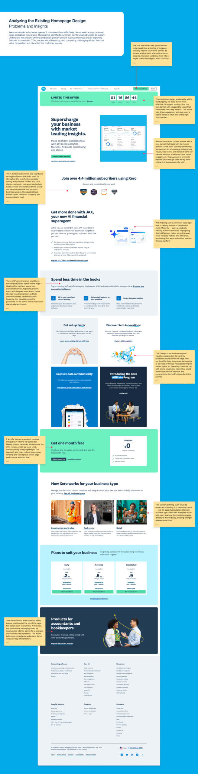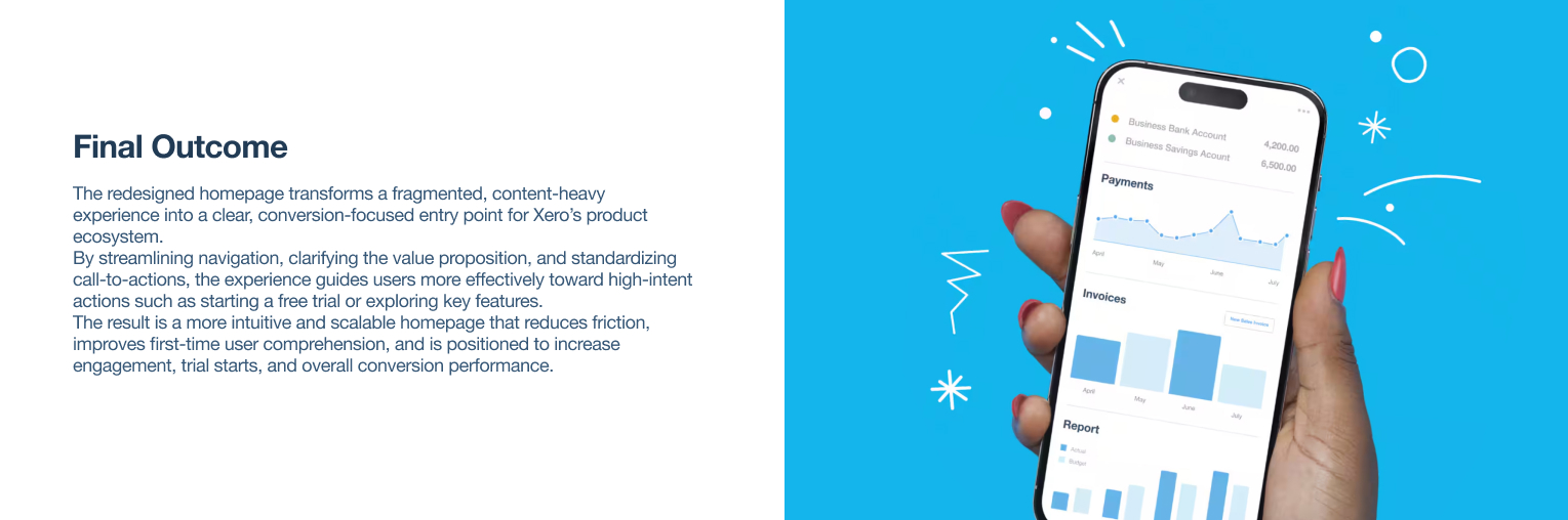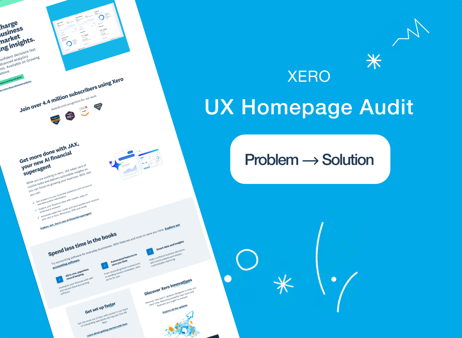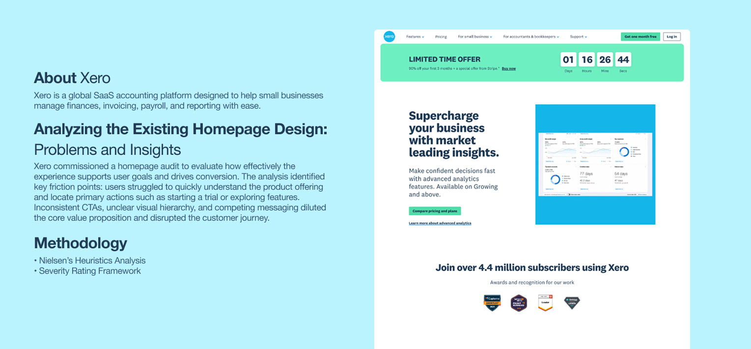 This project focuses on a homepage UX audit and redesign, aimed at improving how Xero communicates its value and guides users toward key actions such as starting a free trial and exploring core features.